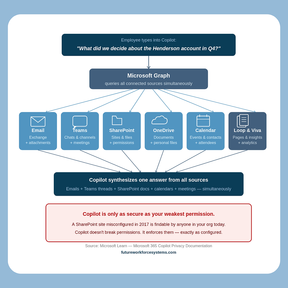 Microsoft 365 Copilot accesses data through Microsoft Graph — which means it can reach emails and attachments in Exchange, documents in SharePoint and OneDrive, Teams chats and channel messages, meeting transcripts and recordings, calendar events and contacts, Loop pages, and Viva content. All of it. Simultaneously.